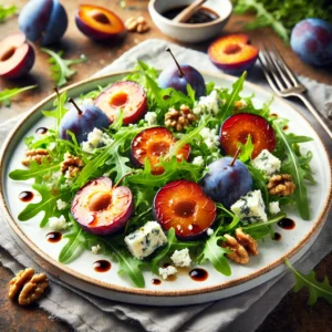 Sałatka z pieczonymi śliwkami, rukolą i serem pleśniowym